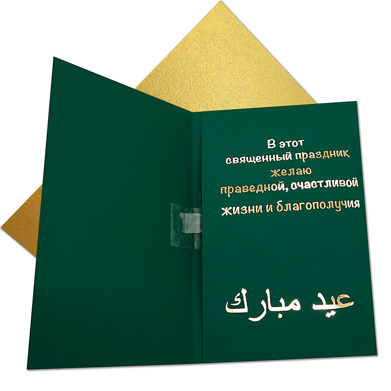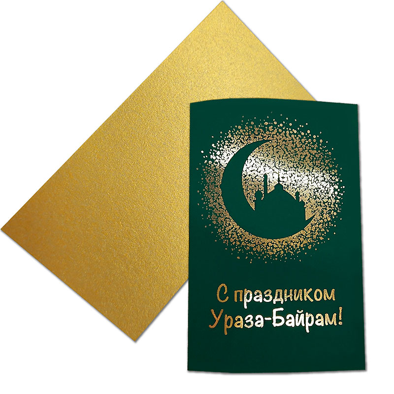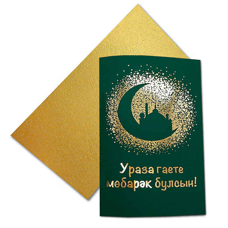 Музыкальная поздравительная открытка (на татарском языке "Ураза гаете мөбарәк булсын!" и на русском языке "С праздников Ураза-Байрам!" (поздравление может быть написано на любом другом языке по желанию покупателя) с золотым тиснением и в золотом конверте, посвященная окончанию священного месяца Рамадан. Дизайн открытки и голосовое сообщение могут быть изменены по желанию покупателя.